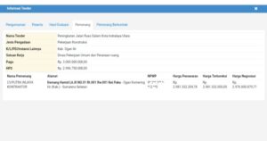 Nama tender proyek tersebut peningkatan ruas jalan dalam Kota Indralaya Utara, jenis pengadaan pekerjaan konstruksi, K/ L/ PD/ Instansi lainnya Kabupaten Ogan Ilir, Satuan kerja Dinas Pekerjaan Umum dan Penataan Ruang dengan pagu Rp3 Miliar dan Hps Rp2.996.750.000,-.